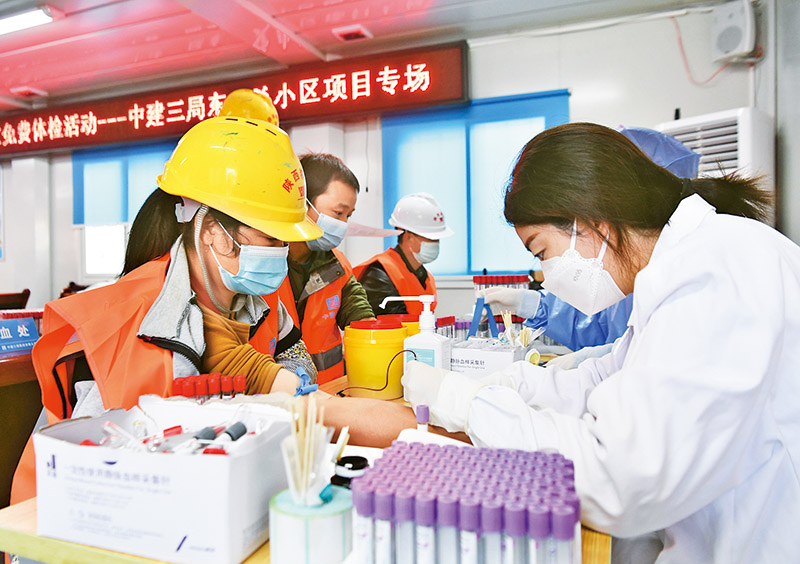陕西省总工会开展“送体检进工地”万名农民工免费体检活动,组织医务人员走进多家建设单位,分批次为一万余名农民工开展健康体检和医疗咨询。图为2021年11月19日,在西安市一处安置小区建设项目,工人在接受身体检查。 新华社记者 张博文/摄