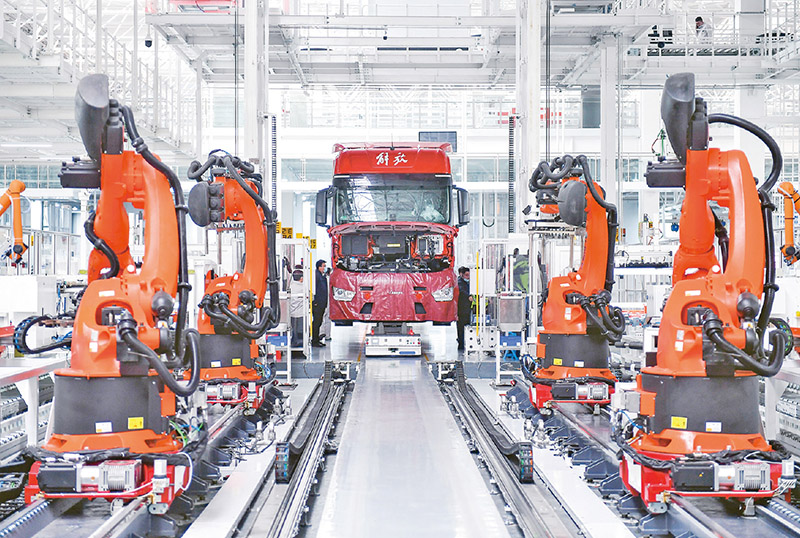 智能制造是先进制造技术和新一代信息技术的深度融合,是我国制造业高质量发展的主要方向。图为2023年1月31日,工人在位于吉林长春的一汽解放J7智能工厂内进行整车装配作业。 新华社记者 许畅/摄