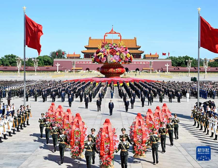 9月30日上午,党和国家领导人习近平、李强、赵乐际、王沪宁、蔡奇、丁薛祥、李希、韩正等来到北京天安门广场,出席烈士纪念日向人民英雄敬献花篮仪式。新华社记者 申宏 摄