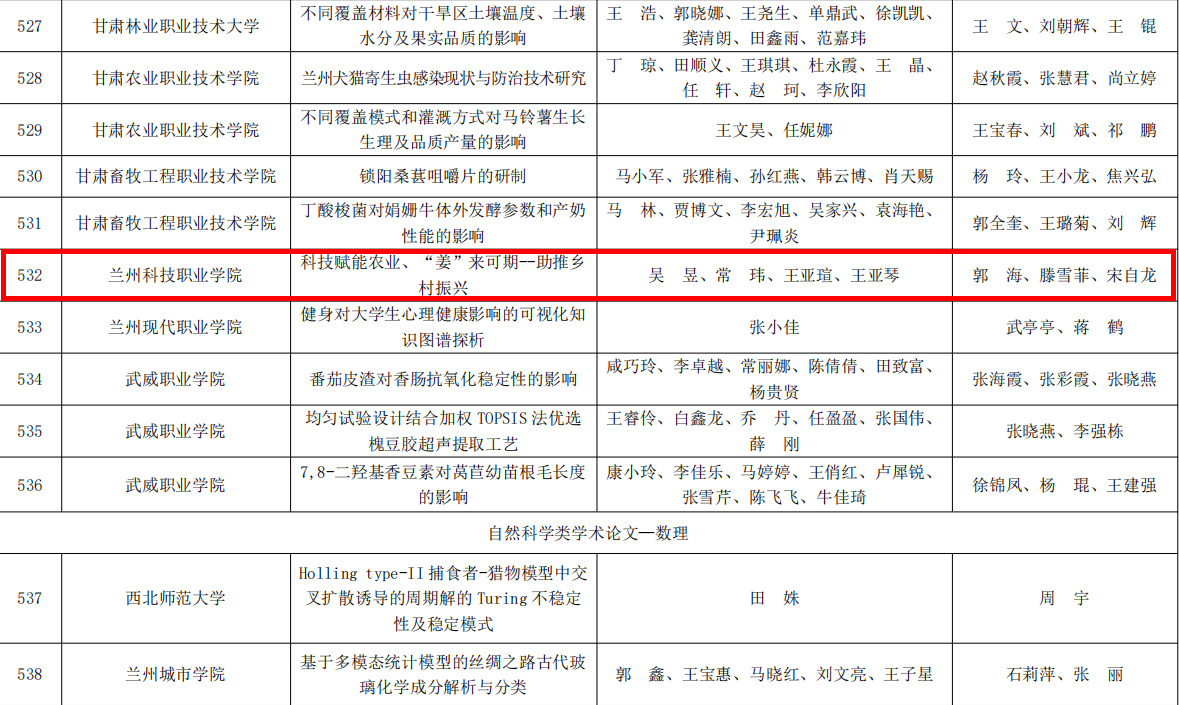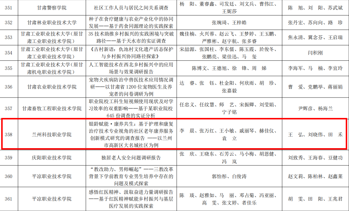 其中,欧博官网王弘、刘晓伟、田禾三位老师带领学生李晨、张万红、王小敏、戚丽琴、赫佳仪、袁立组成团队以作品《银龄赋能·康养共生:基于护理和康复治疗技术专业视角的社区老年康养服务创新模式研究的调查报告 ——以兰州市高新区大名城社区为例》获得三等奖;张雷磊、温沛、李宗龙三位老师带领学生白天杨、罗家璇、孙乐乐组成团队以作品《青春力量助力中国生态文明建设的路径探索》获得三等奖;郭海、滕雪菲、宋自龙三位老师带领学生吴昱、常玮、王亚瑄、王亚琴组成团队以作品《科技赋能农业、“姜”来可期——助推乡村振兴》获得三等奖。
